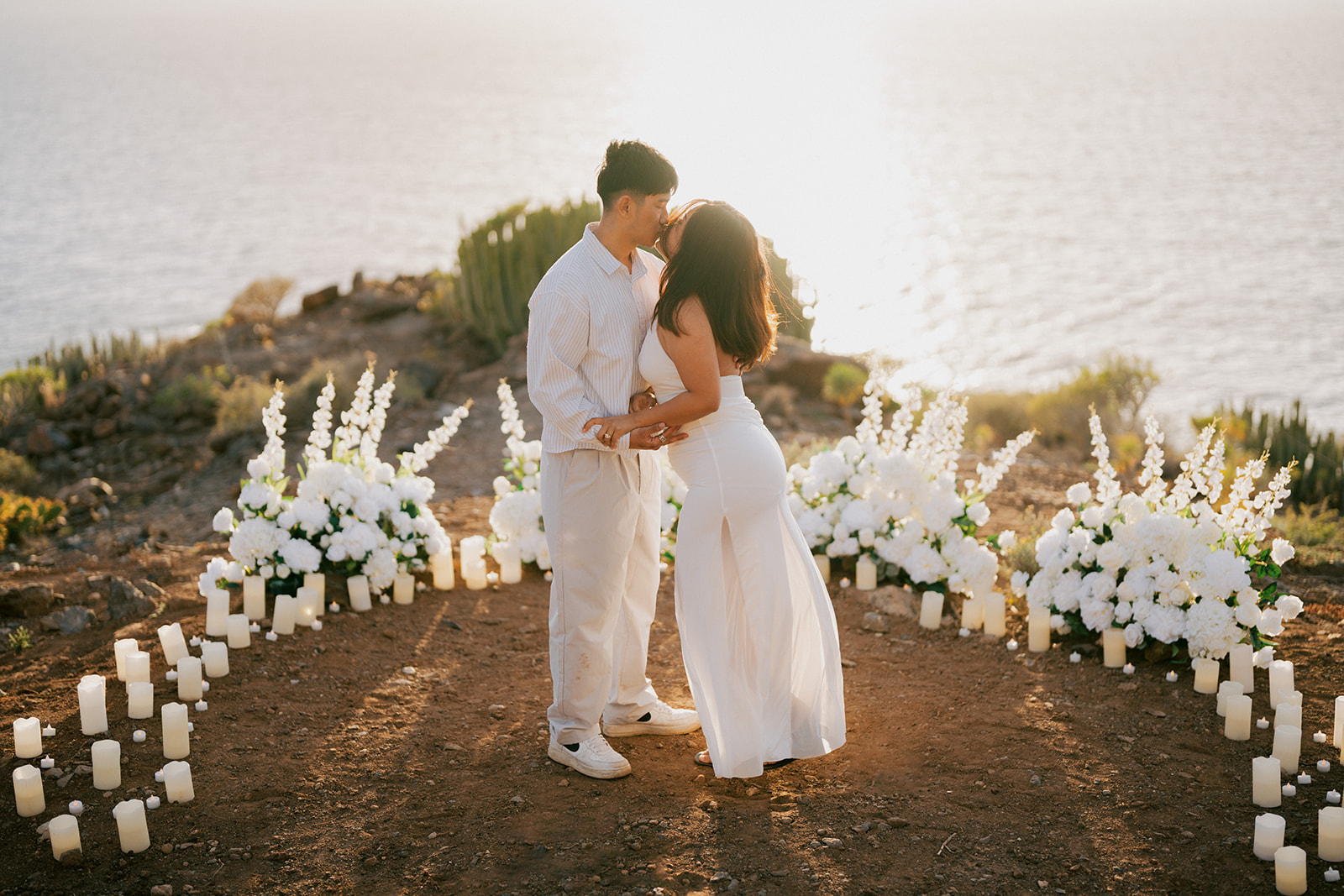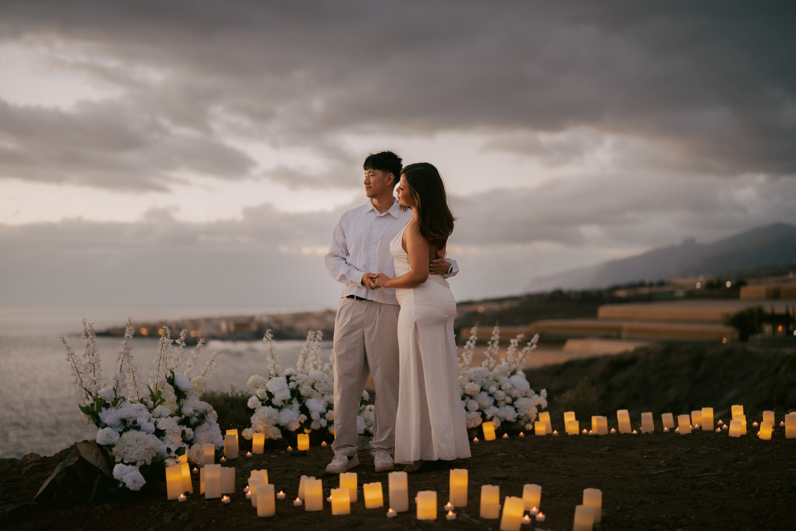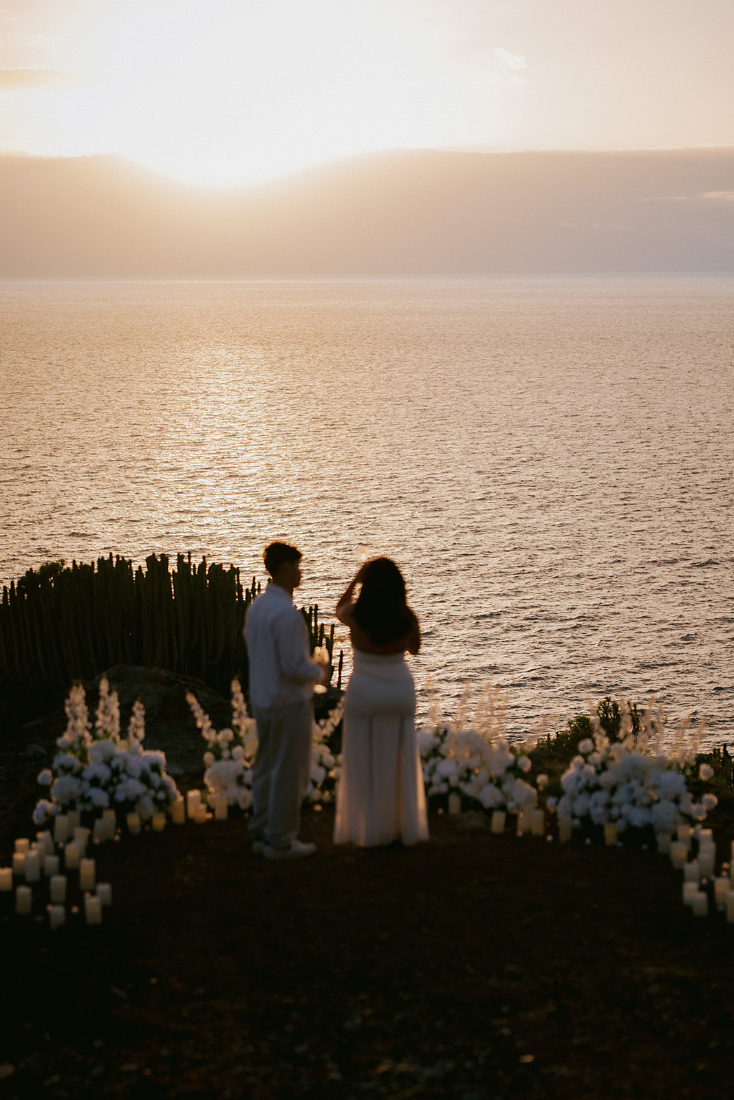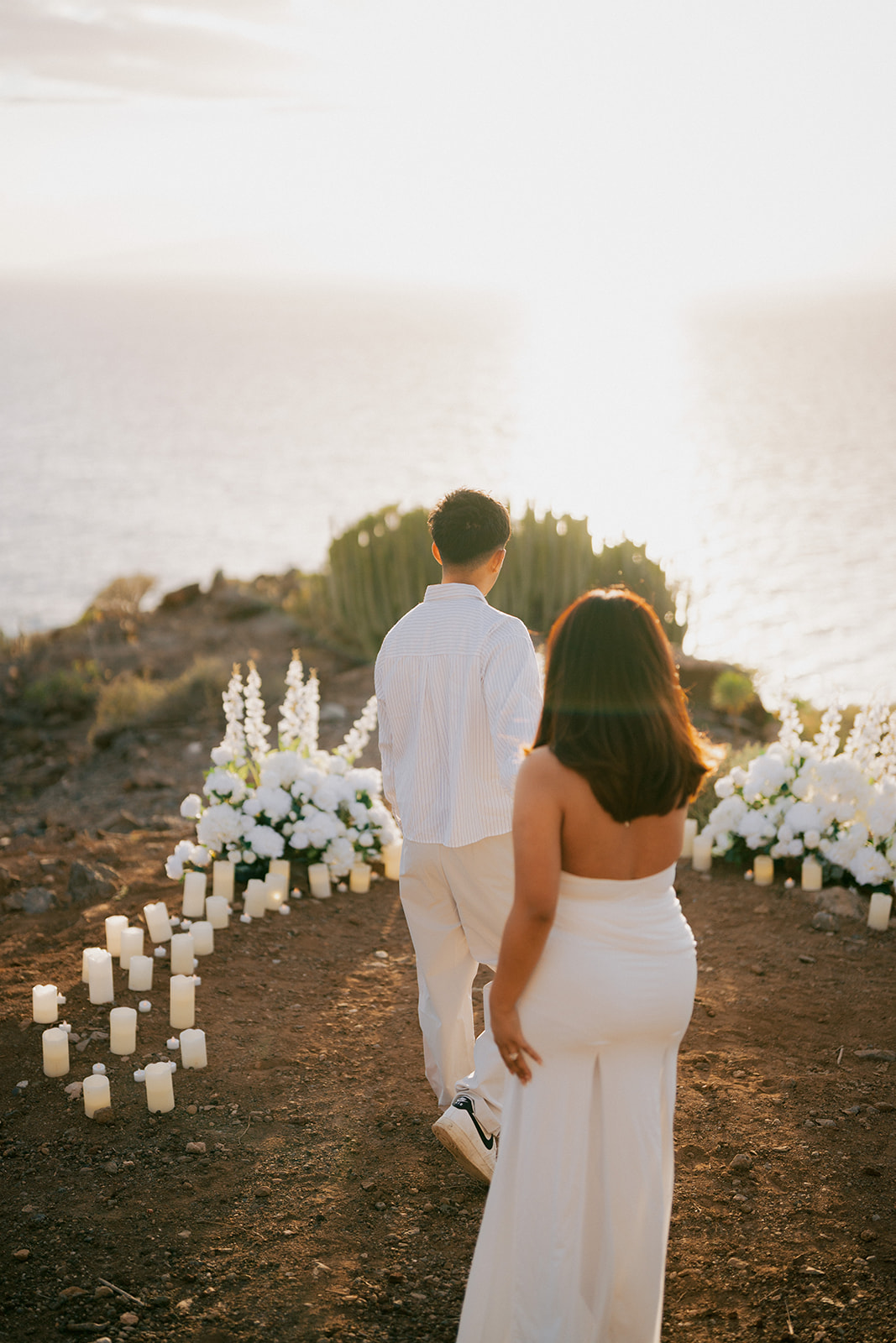 S. contacted me about a month ago, sharing his vision of a romantic sunset proposal on the cliffs, overlooking the ocean here in Tenerife. He imagined white flowers, soft candlelight, and an intimate, dreamy atmosphere—something truly unforgettable for such a special moment.