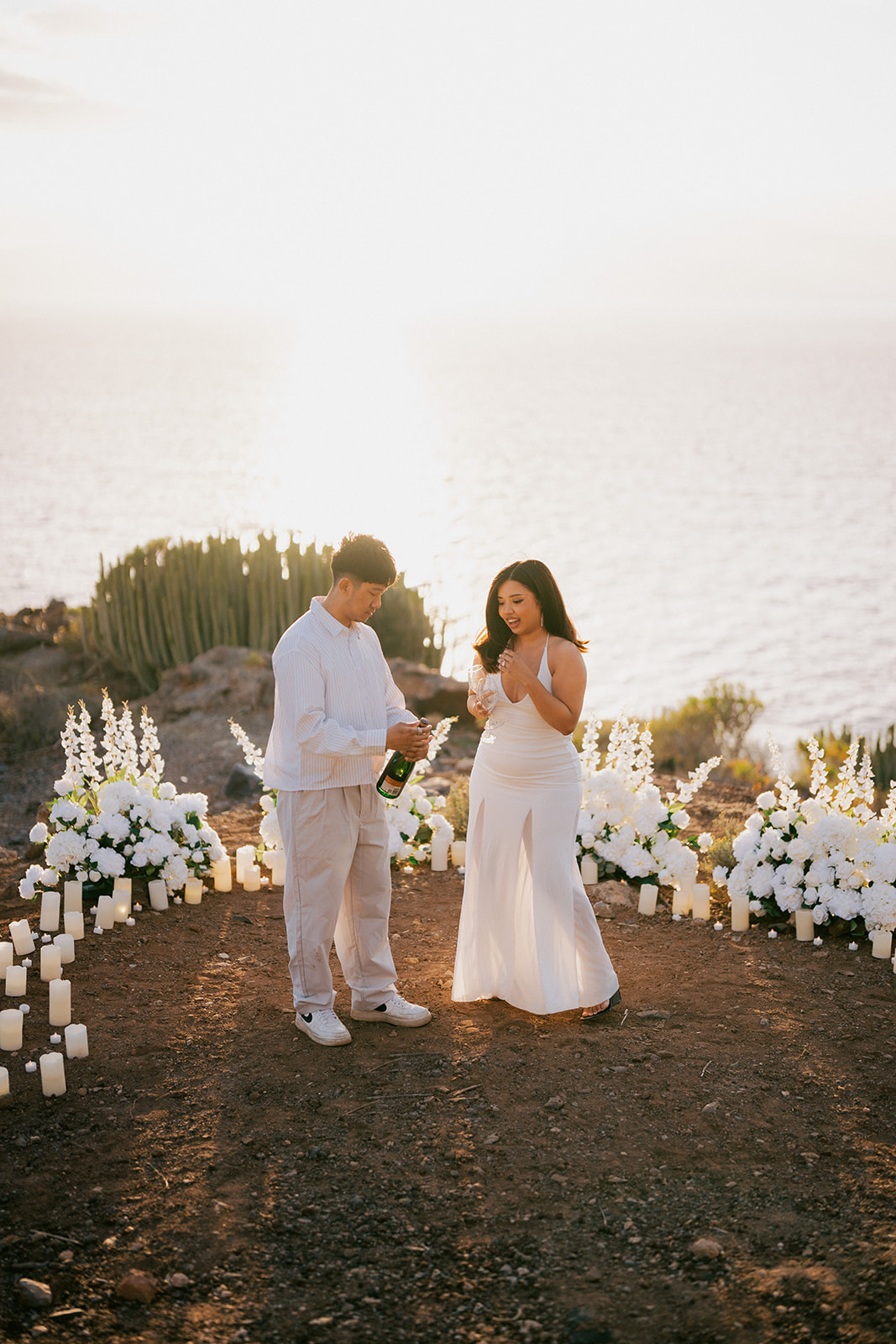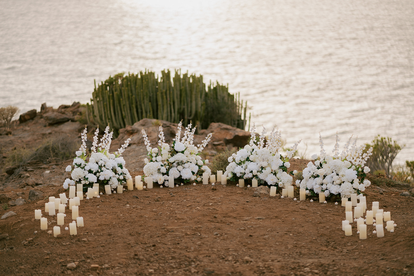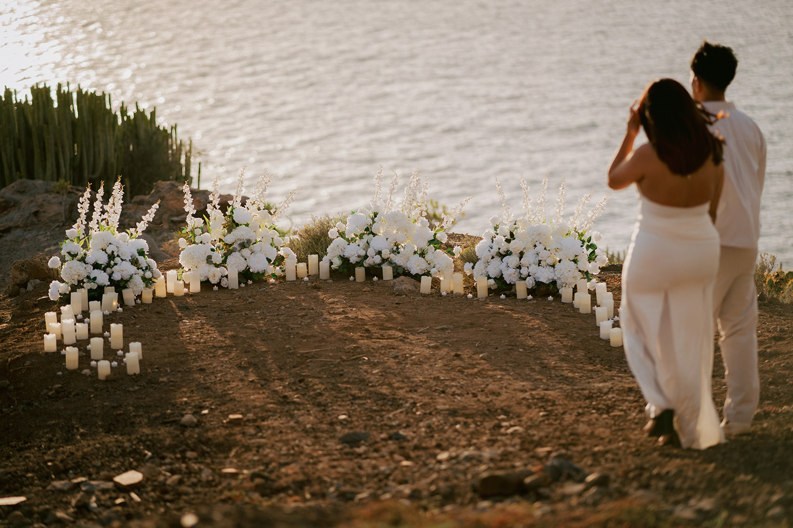 S. contacted me about a month ago, sharing his vision of a romantic sunset proposal on the cliffs, overlooking the ocean here in Tenerife. He imagined white flowers, soft candlelight, and an intimate, dreamy atmosphere—something truly unforgettable for such a special moment.