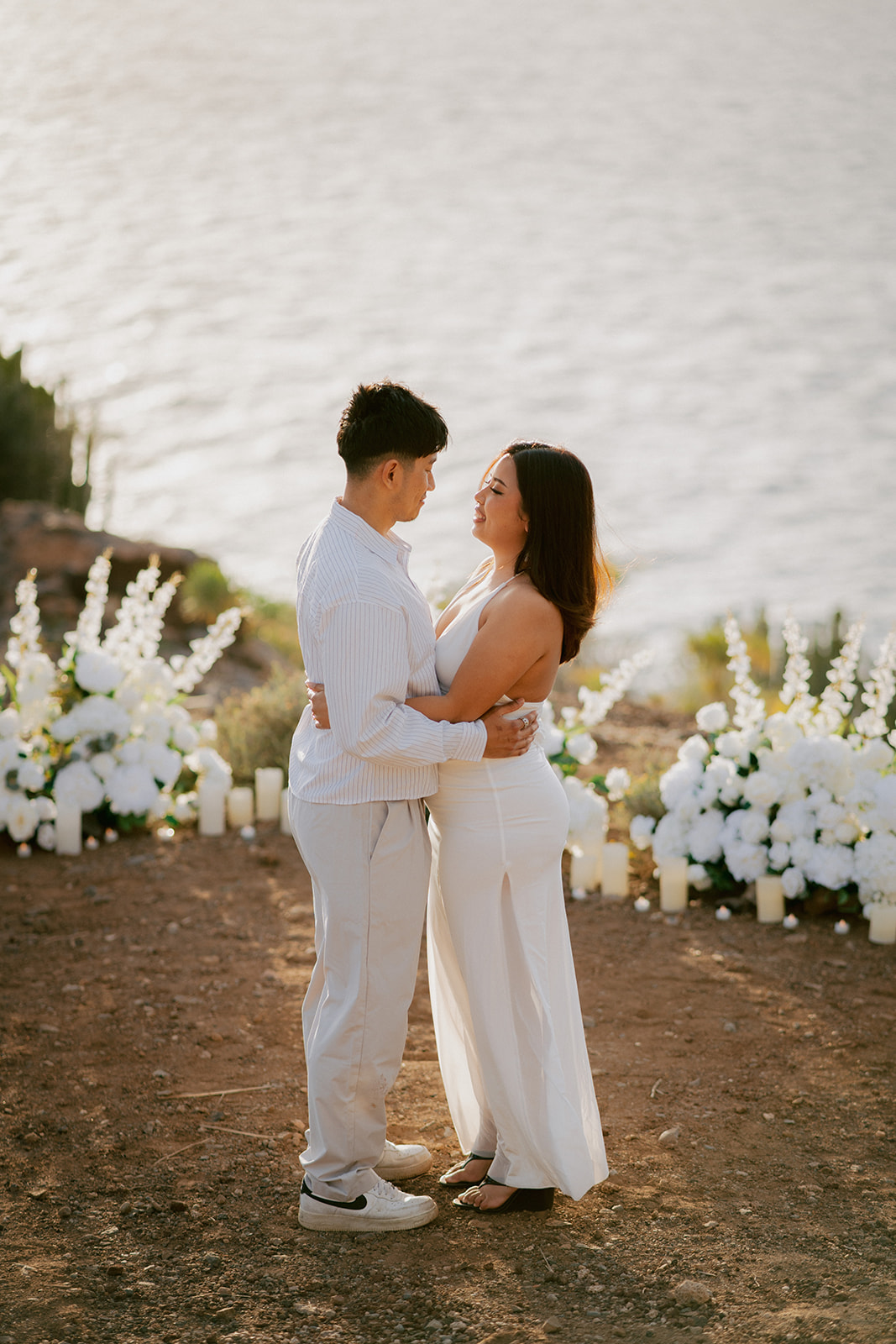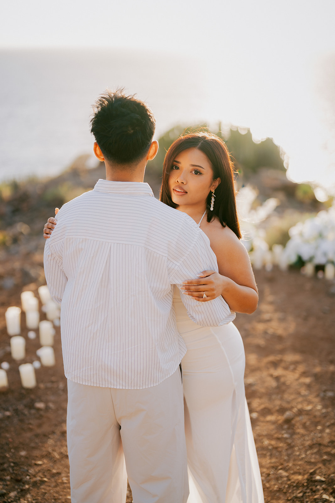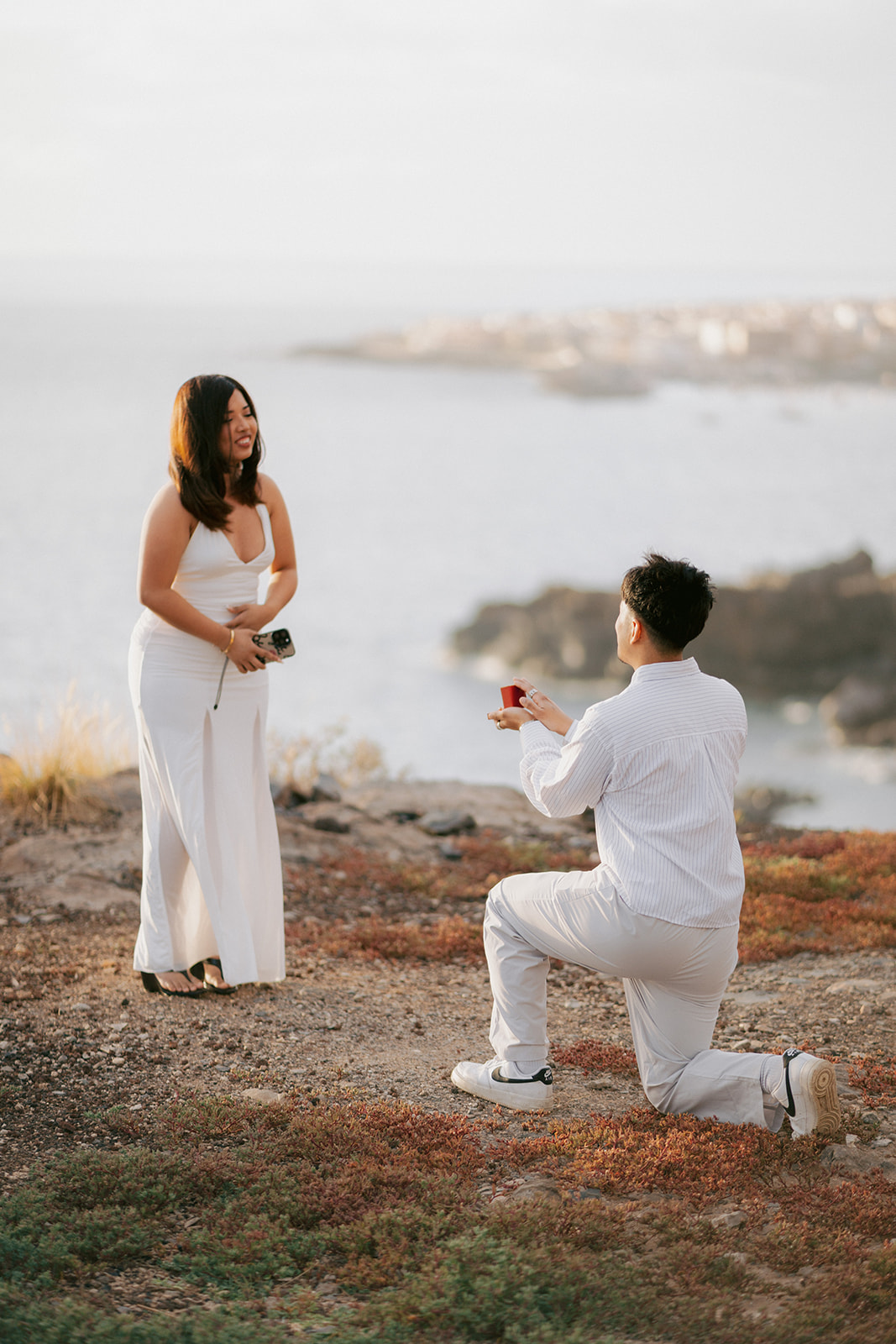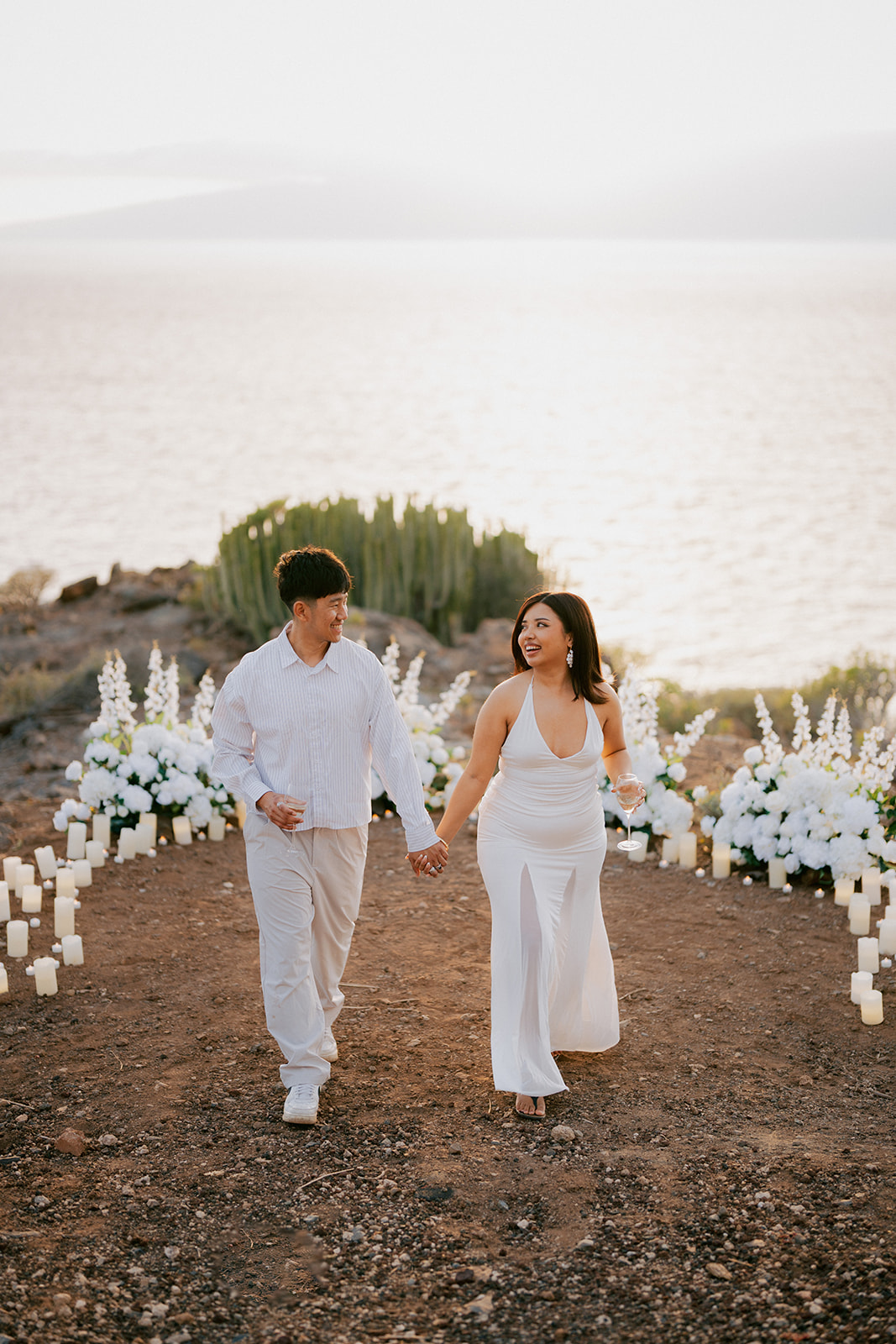 S. contacted me about a month ago, sharing his vision of a romantic sunset proposal on the cliffs, overlooking the ocean here in Tenerife. He imagined white flowers, soft candlelight, and an intimate, dreamy atmosphere—something truly unforgettable for such a special moment.